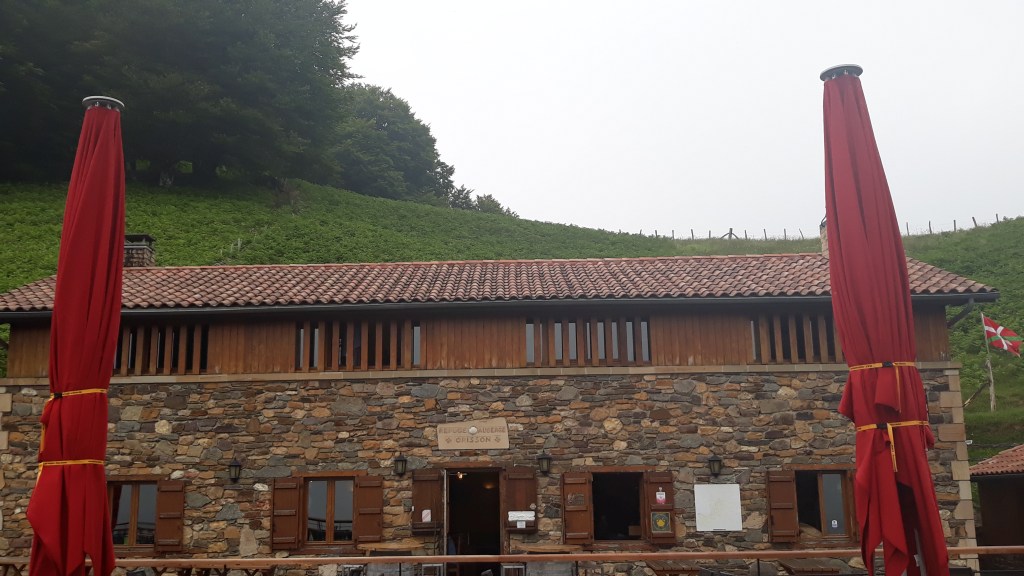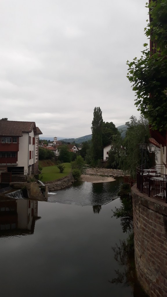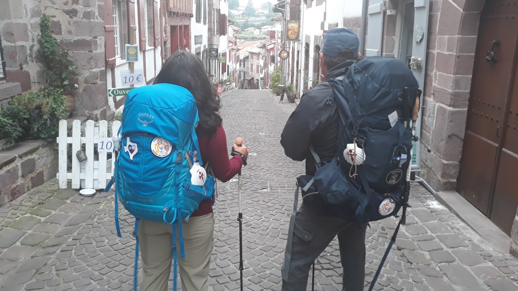 Most, if not all, of our fellow peregrinos we met on the train Sunday (June 30th) began their Camino this morning. St. Jean Pied de Port is a history filled old town. We walked the streets taking in the city’s history and historical sights. A must stop was the Notre Dame church where we prayed for protection over our pilgrimage. We experienced our very first night in an albergue and it was a great experience. We were on the second floor of the Gîte Le Chemin vers l’Etoile. The rooms are very small containing only a set of bunks per divided space. They are just a bit wider than my husband’s arm span and not much deeper. A small curtain provides sufficient privacy. It is very clean which is a huge plus. This floor has an occupancy of sixteen but there are only four of us here. We ordered the first of many “peregrino meals.” This consists of soup or salad, an entree, dessert and wine. It was delicious.
