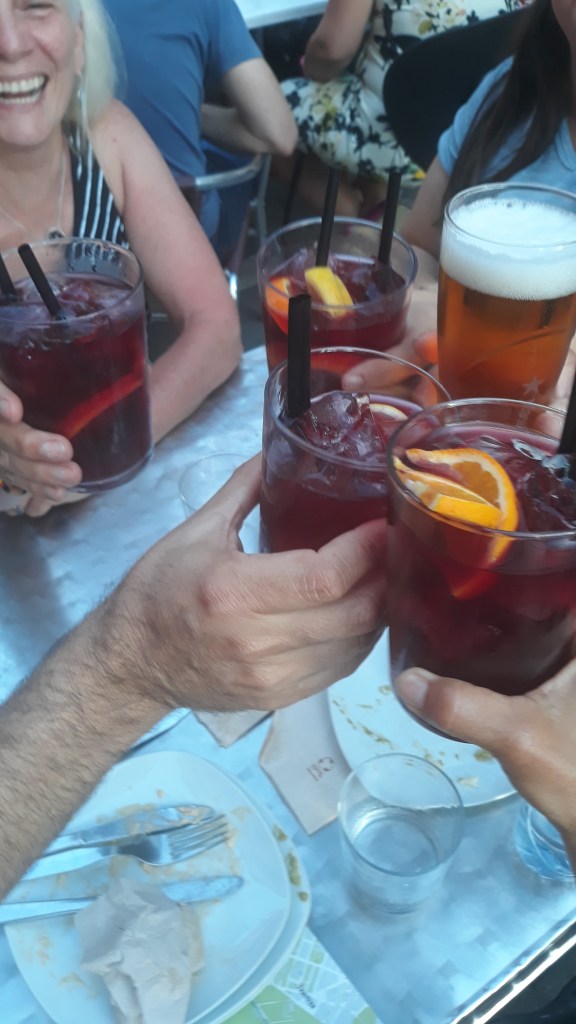 Relief stepping into Pamplona’s city limits was short lived. It was a case of “you’re here but not there” scenarios; turns out our AirBnB was located another mile into the city center. Ann joined us on today’s hike also and that final 5K was brutal on her hip. Upon arrival at our place of refuge for the next two nights we discover her hotel room is on the complete opposite side of town. Our host didn’t skip a beat; a taxi was out front waiting for Ann in less than five minutes. Settled in, showers taken, preparing for a nap when we receive a text that had us hopping out of bed and out the door in no time. Salvador and Andrea are not staying for the festivities tomorrow and would like for us to join them for dinner. We meet at the Plaza Ayuntamiento (City Hall) for tapas and sangria. The air is filled with lively conversations of many languages yet laughter is universal. We say our goodbyes as we will most likely, once again, not see another set of friends again on the trail.