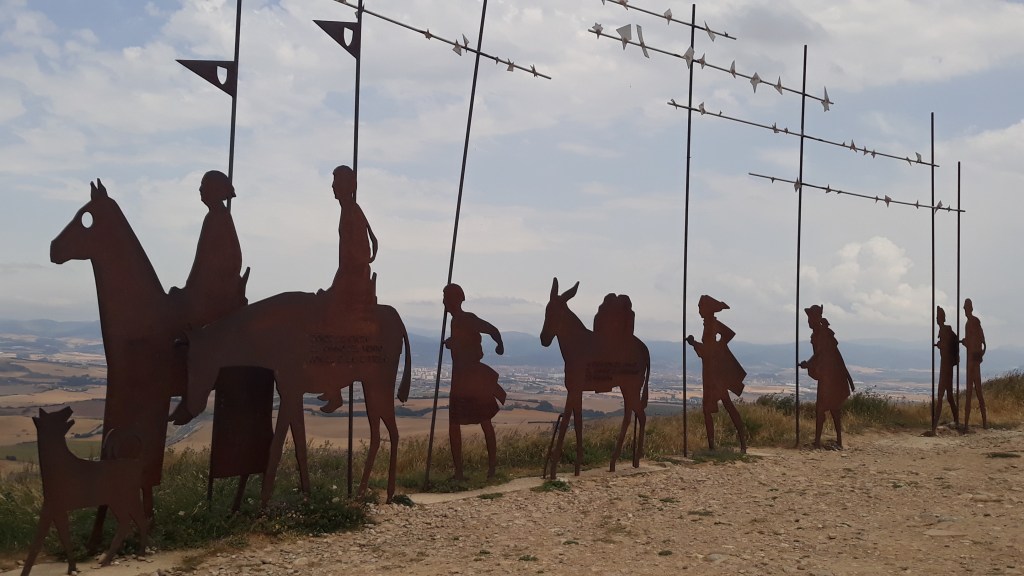 We got a really late start leaving Pamplona as we tried to resolve some banking issues and load up on foot care supplies before leaving the city limits. It’s good to feel our backpacks against our bodies again. They have become familiar, a comfort, knowing everything you need is contained in that one piece of equipment. Well, that and our hiking poles; can’t tell you how many times they have assisted on the climbs and saved us from some nasty falls on the descents. The joke has become “define rolling hills ” as we discuss what the day’s hike will entail. The climb to Alto de Perdon held its own challenges as we retrain our bodies after three days rest. After an uphill there is always a downhill and they always seem to be never ending. 12 1/2 miles later we entered Uterga. We agreed it was time to take a break and decide whether to continue on or call it a day. Our decision was made for us. As we walked into the patio area of the first albergue/bar area we encountered we hear someone calling our name. It is Mary from California. We met her only briefly while having dinner our very first night in St. Jean. We haven’t seen her in a week and we have lots to catch up on. This time during our communal dinner we learn she is an international educator. She has taught in Tokyo, Taiwan, and Germany to name a few. She decided to become a teacher at the age of 50 after retiring from her first profession as an analyst. Here she is as a 60-year-old solo traveler, as she stated because she decided she wanted to take a “walking summer vacation”. What a spirit!