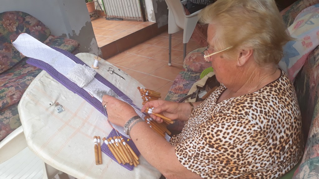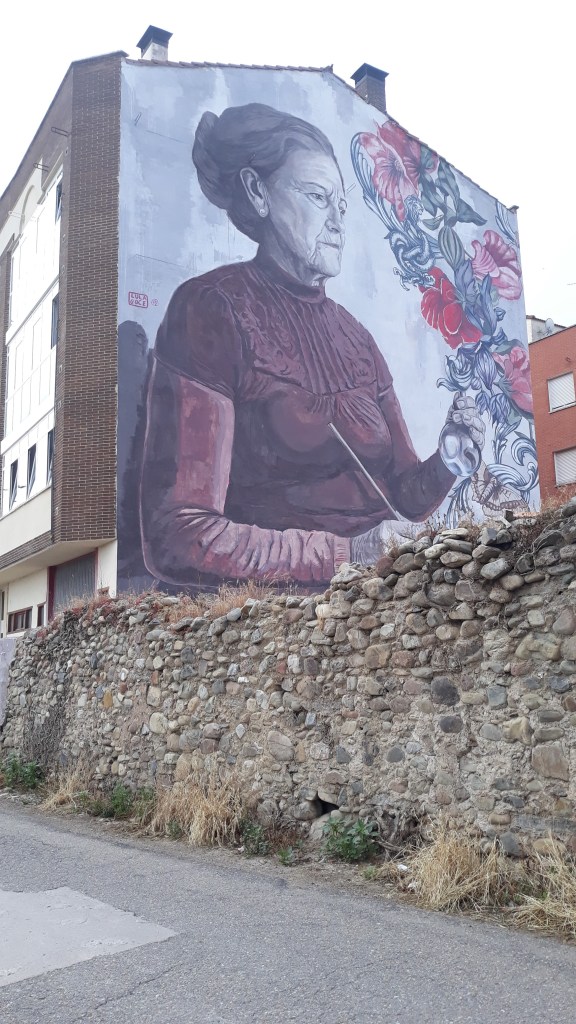 The last three days have made us especially grateful to have been born and raised in Texas. The temperature is hovering in the low to mid 90’s by midday. While it is a bit uncomfortable it is bearable. Our Camino friends, particularly those from Ireland, Sweden, France, Spain, Japan, and Germany are having great difficulty. Many have begun leaving long before dawn to avoid the heat. Our tolerance has allowed us to take longer breaks, enjoy our breakfast and lunch stops, and keep a comfortable pace. We have enjoyed conversations with local farmers, shop owners, and even a lovely lady who was sitting just inside her doorway hand making lace. I marveled at her skill. She shrugged as she explained it was a way to pass the time and graciously showed me some of her handiwork.