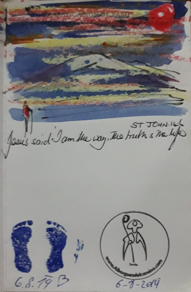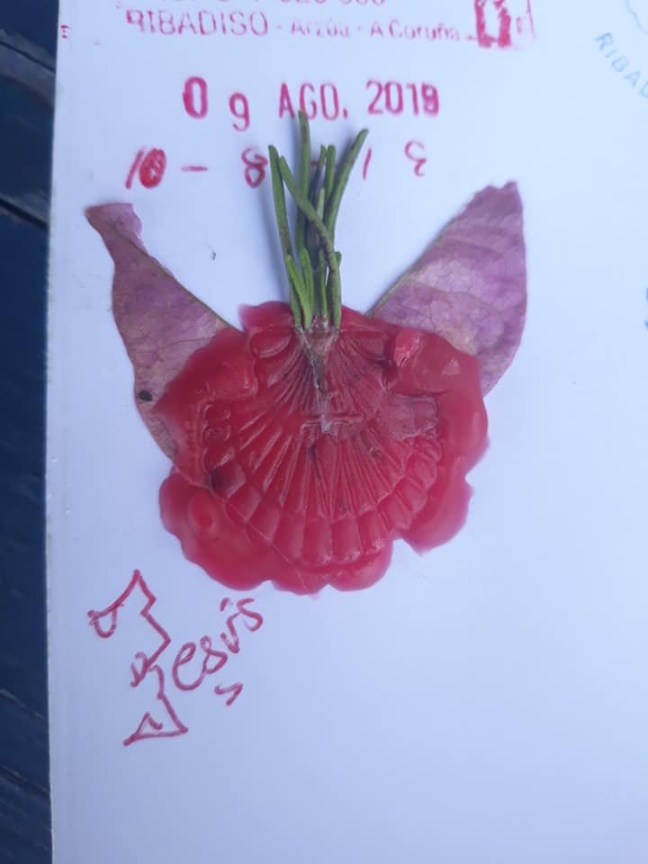 We proceeded our hike and came upon a small stone hut. A sign outside read “Art’s Gallery.” Stepping inside was a like opening a storybook filled with brilliantly colored pages. The cozy couch and lavender aroma beckoned one to “be still and in the moment.” Each of the watercolors depicted scenes from the Camino. Each one pulled you into the spot it depicted and made you keenly aware of how it felt to be in that space. Art explained that he was a very broken man when he first walked the Camino in 2006. As he walked and upon reaching Santiago he knew something had changed and he felt a tinge of faith. After his return home he was restless and felt pulled back to the Camino. He proceeded to walk a second time. When he came upon this stone building in disrepair and for sale, he purchased it and has since renovated it into his home and studio. He relaid he felt incredibly at peace here and his faith grows day by day. He has discovered that faith is like a muscle, one must exercise and use it or it will atrophy and be of no service. I am in awe of his talent and curiously ask if he has created his own sello. We collect sellos (stamps) in our credencial at each place we stay, eat, visit, etc as proof that we have been on pilgrimage and must submit them to the Pilgrim’s Office in Santiago to receive our Compostela (Certificate of Completion). Art advises that he does not have his own sello but that on a few occasions will draw something for someone in their credencial. I tell him I would be grateful if he would just write the name of his gallery and sign his name on mine. He blessed me with his incredible talent in a manner beyond what I expected. He shared his faith with me and I explained to him today was Elias’ birthday and that I had been praying over our son since my first footstep this morning. He asked if he too could take a moment to pray for him and we did. I almost left in tears. Check out artworkbyart.com
