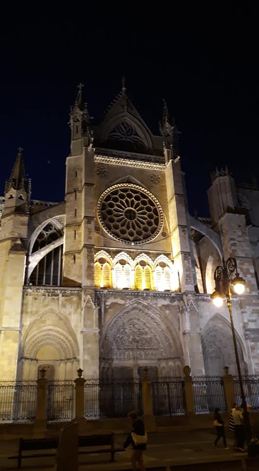 We pushed a bit more than our standard 15-mile day on Thursday and Friday to make our way to Leon on Saturday an easy 10 miles. Friday was a particularly long day. After our now routine settling in, showering, and washing clothes (admin duties as Becca would say 😉) we went off to explore and decide where to have dinner. Mancilla de las Mulas is not a large community. After the second round through the streets the locals were looking at us like we were lost or crazy. By the third round I was in agreement with the latter. Fatigue and hunger after an 18-mile day makes one act in strange ways. I was in the midst of protest when Vidal spots Becca across the plaza. What a treat to see her again! She had not had dinner either and asked us to join her at her albergue for the pilgrim’s meal. She assures us we will not be disappointed as she is staying in a very small, family run location and they have a beautiful grapevine covered eating area. It is just as she describes and more. The vines growing overhead are filled with clusters of grapes that gently hang from its branches. The surrounding area has flower filled pots and antique decor. I believe tonight’s meal is the best one we’ve had thus far. Having run into Becca again has made this evening perfect. This time we make sure to exchange contact information.