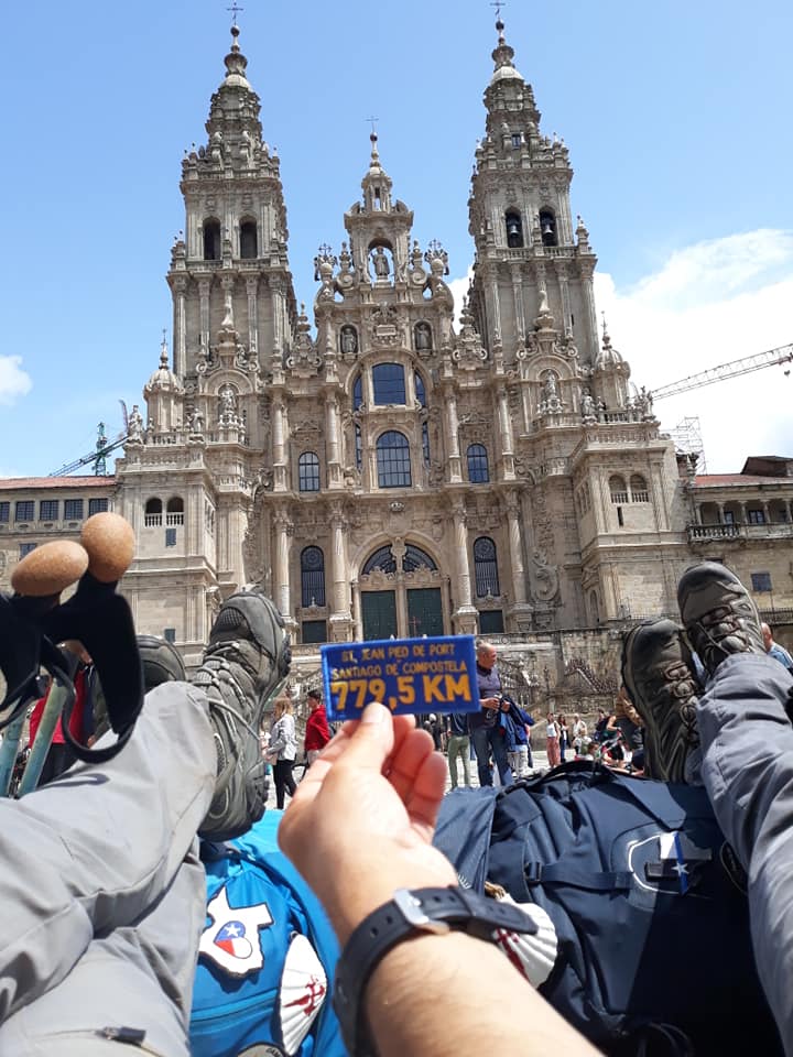 As we entered the old city of Santiago and approached the outer edges of the cathedral plaza we began to hear the soulful sounds of bagpipes. Before descending the final steps we paused to take a deep breath. Each step downward a replay of our undertaking. 500 miles in 41 days…..each footprint a memory eternally etched in our hearts. Our backpacks holding everything we’ve needed on this journey, revealing we really don’t need all the “stuff” in our lives we think are necessary. Aching muscles and sore feet landing on the cobblestone stairway reminding us we are so much stronger than we imagined. Our final stair step is also the first into the plaza. I continue following Vidal as we seek an open space among the many peregrinos who have arrived before us. I love the familiar view of his backpack ahead of me, always leading, guiding, protecting. He finally turns to face me and the tears streaming down his face match mine. His embrace encompasses me; the reality of what we’ve just completed is overwhelming. Our first view of the Cathedral de Santiago de Compostela is breathtaking.
